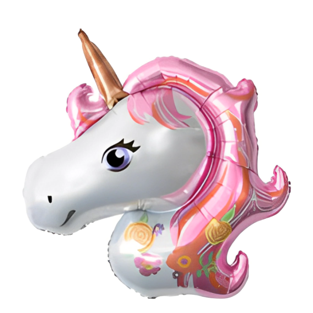 Balão com o formato de cabeça de unicórnio metalizado branco e rosa com detalhes de flores coloridas.